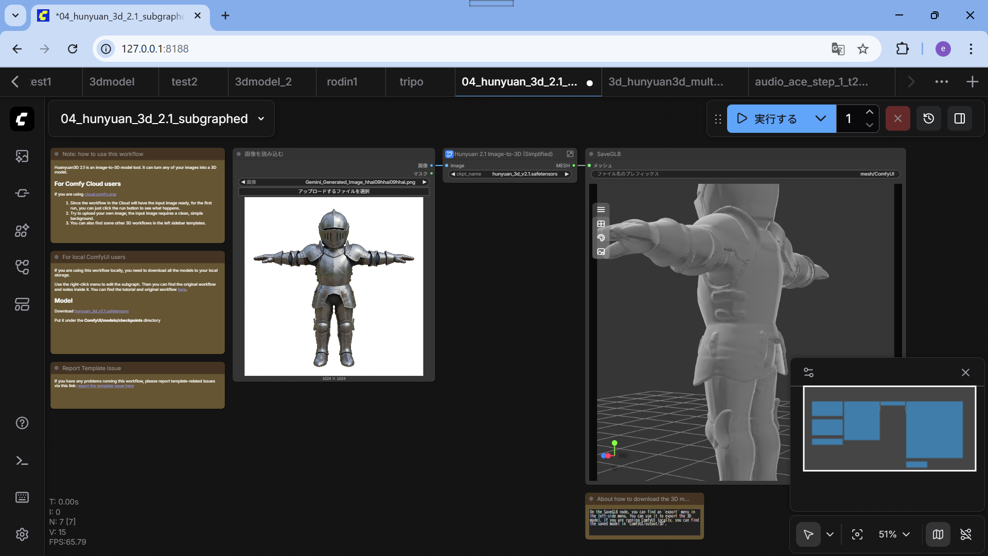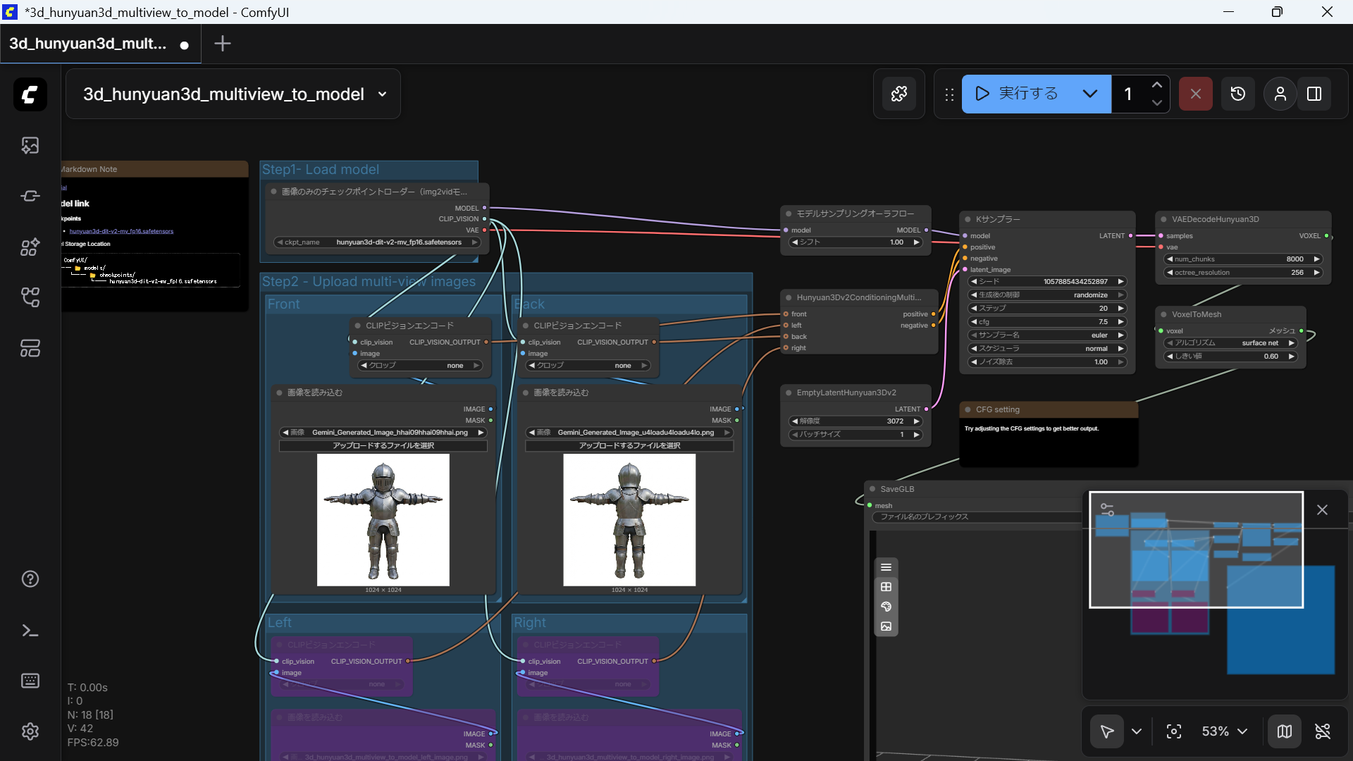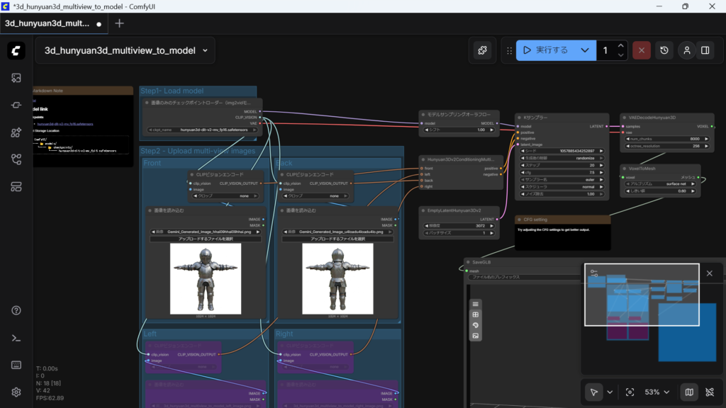turbo版は、推論時間を短縮するために特別に調整されており、ワークフロー上ではCFG(Classifier-Free Guidance)を1.0に設定し、専用のガイダンスノード(flux guidanceなど)を併用して制御します。• ハードウェア要件: Hunyuan3D 2.0シリーズは軽量に設計されており、形状生成だけであれば標準バージョンで6GBのVRAMがあれば動作可能です。
